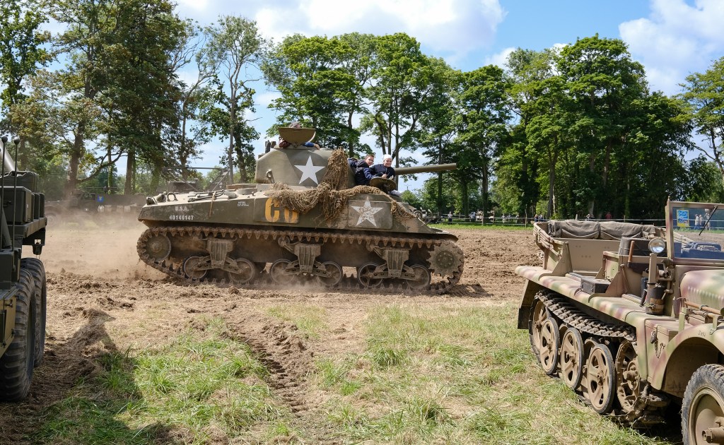 At various locations around Manche and Calvados, mostly outside the major museums, there were reenactment camps set up with various World War II vehicles, jeeps, trucks, ambulances, tanks and so on. Europeans dressed as American GIs or British Tommies set up foxholes, posed with replica firearms, and happily posed for photos. Most of these people were friendly – a small group even offered my kid an M1 helmet to take a photo in front of their military truck with them. It felt a little incongruous to me to see so many WW2 American GIs chattering to each other in French, Dutch, Polish- even German!