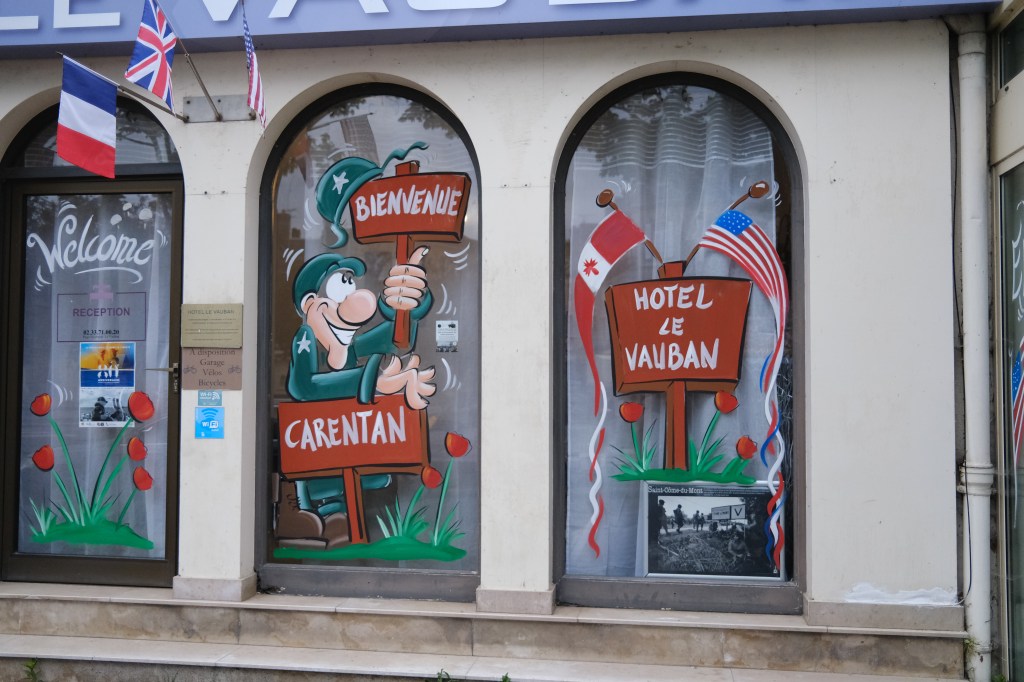 Amid the sometimes carnival atmosphere of cosplay, 40s swing music, cider and saucisse sandwiches, I feel among the Normans a legitimate sense of gratitude to that generation of Americans, Brits, Canadians, and Poles. Yeah, there’s a commercial aspect and tourism draw with all the American and UK flags strewn around, the English menus and painted windows welcoming visitors. For many, it’s an economic boost and a party, for sure. But there were also moments like when I was approached randomly by a French woman excitedly telling me there was an actual World War II veteran nearby shaking hands with people. The aging veterans, pushing 100 years old, were like celebrities there during the commemorations. Being able to see the events with actual veterans of that war and the Normandy campaign present was a major factor in us going.